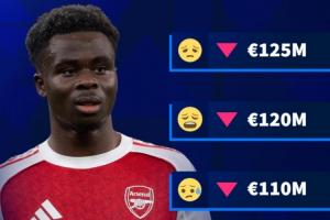 体育资讯03月08日讯 德转明天将更新英超球员身价,它们今天预热了萨卡身价将在更新后下跌,最低将跌至1亿欧。