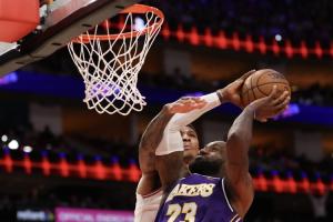 GIF-燃尽了!詹姆斯先连续防守又全力冲刺上篮被犯规 手肘再次受伤!