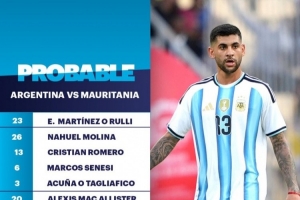体育资讯3月27日讯 北京时间明天7点15分,阿根廷将在友谊赛中对阵毛里塔尼亚,TYC预测了阿根廷队的首发阵容。
