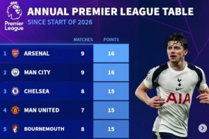 体育资讯2月24日讯 《转会市场》统计了2026年英超各队积分情况,热刺9轮仅4分垫底。