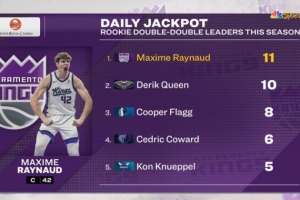 国王42号秀雷诺再次拿到两双,超过鹈鹕新秀奎因,两双次数跃升为本届新秀第一。