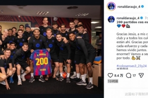 阿劳霍此役为巴萨替补出场,这是他为巴萨出战的第200场比赛,阿劳霍获赠纪念球衣,他在社媒晒出与全队的合照,并写道:“身穿巴萨球衣的第200场比赛。